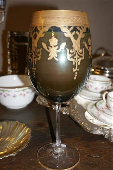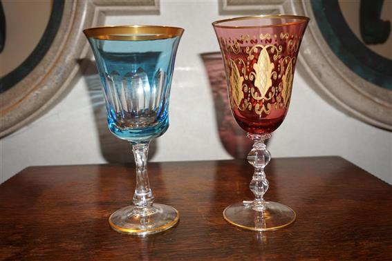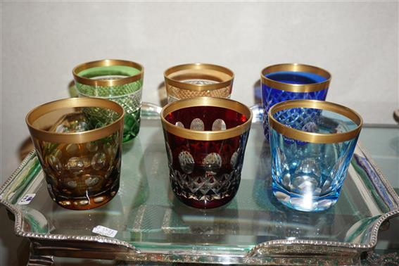 Favoloso set di bicchieri in cristallo inciso colorati con decoro di oro zecchino con vassoio in sheffield d'epoca inglese Offerta speciale: 400,00 Euro anzichè 700,00 Euro