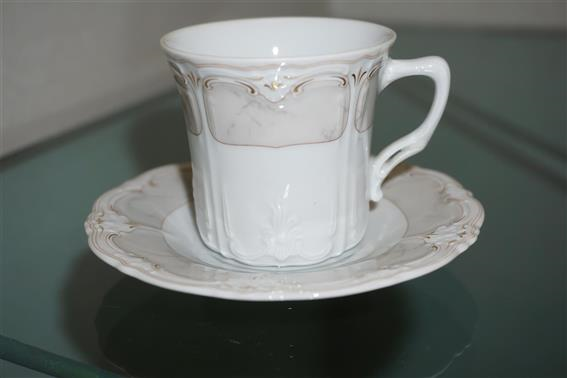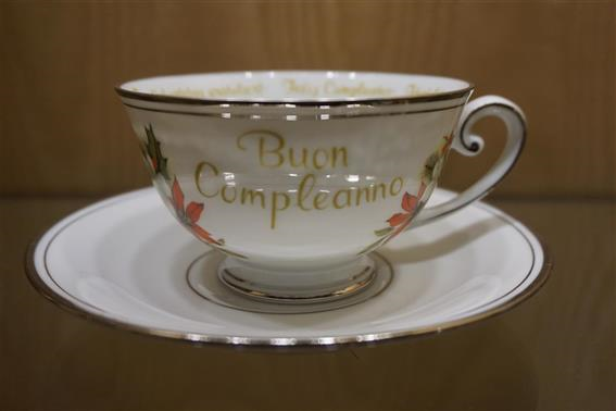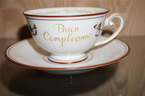 Tazza di "Buon compleanno"con piattino in porcellana con bordino in oro zecchino. Offerta speciale: 80,00 Euro anziché 120,00 Euro