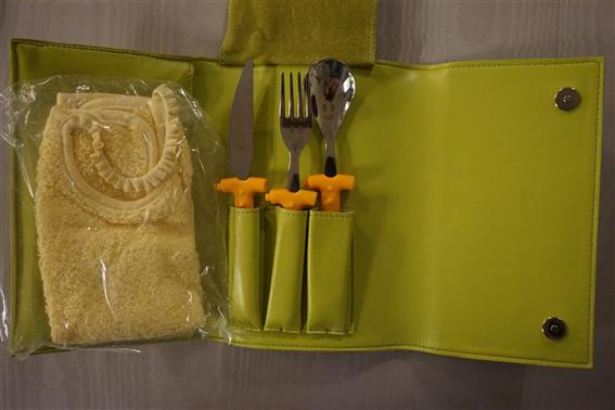Set posate e bavaglino per prima comunione con cofanetto in pelle verde e un girasole in argento 925%. Offerta speciale: 85,00 Euro anziché 170,00 Euro